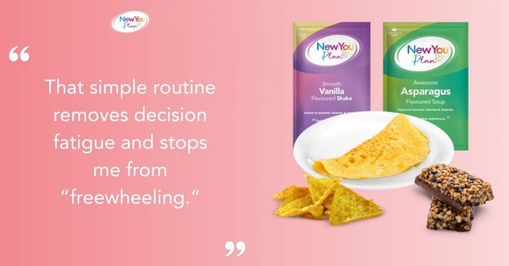 Helen: Planning changed everything for me. I keep four large clear boxes upstairs – one each for Shakes, Soups, Evening Meals, and Crisps/Bars/Snacks. Once a week I do a quick stock check, rotate by date, and bring 28 packs downstairs for the week. That simple routine removes decision fatigue and stops me from “freewheeling.” I still keep flexibility; if I fancy noodles instead of pasta, I swap. It is structured, not rigid, which makes it sustainable.